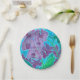 Postcard plate featuring beautiful floral painting, window garden - beautiful orchid flower, triangle leaves of oxalis and some succulents on background. Colour palette: purple, violet, lilac, lavender, teal, green and blue colours