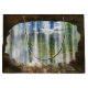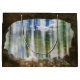 Looking out of a cave under a waterfall onto an idyllic scene in a small river valley. Through a gap in the falling water a cottage is visible just beyond the curve of the river. The water streaming past the opening breaks the sunlight into many colours and sparkles.