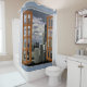 A series of shower curtains with a scene of outdoor landscape seen through multi-paned window with curtains. Give your bathroom the airy look of a picture window with beautiful scenery.