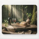 A rustic table set with a bottle of wine, a glass, a loaf of bread, and a ceramic jug is situated in a serene forest setting