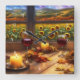 A charming image featuring wine on a rustic table adorned with leaves, candles, and a whimsical field of sunflowers. Perfect as a kitchen or bar wall art clock.