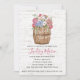 Wine barrel bridal shower invitation with colourful flowers and hand script font. Rustic wood and barrel full of colourful flowers, bridal shower invitation.