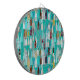 Wine bottles in a range of aqua, turquoise, earth tones and white against a turquoise blue background