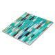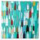 Wine bottles in a range of aqua, turquoise, earth tones and white against a turquoise blue background