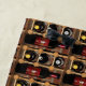 Here is a very cool beach towel which features a repeating abstract pattern of upright red and black bottles of burgundy wine next to more bottles in a brown, gold and yellow wooden wine rack. A rustic orange brick wall background completes the composition.
