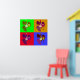 Wine themed still life with wine bottle, glass, grapes and vine leaves, pop art style. Bright colours.