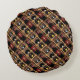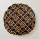 This colourful decorative round pillow features a repeating abstract pattern of an upright red and black bottle of burgundy wine next to three more bottles in a brown, gold and yellow wooden wine rack. A rustic orange brick wall background completes the composition.