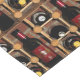 This contemporary table runner features a repeating abstract pattern of upright red and black bottles of burgundy wine next to more bottles in a brown, gold and yellow wooden wine rack. A rustic orange brick wall background completes the composition.
