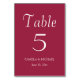 Guide your wedding reception guests to their table with this simple style table number card that features white, stylised lettering on a trendy, wine red colour background. Design is on each side of card. Edit your card to change table number, wedding couple's names and date. Order cards separately for each table number.
