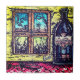A bottle of wine with corkscrew wine opener on plaid tablecloth, yellow walls with window in the background where the landscape view of the scenery sets the tone for viewers. Wine With a View artwork by artist Jason Girard