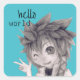 Hand drawn anime and manga-style character is cute. He waves and winks, with detailed braid in hair and a mischievous look.
