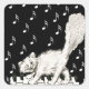 This square sticker has a winking white cat with a big fluffy tail walking on piano keys on a black background covered in white music notes.