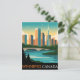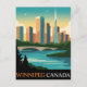A vibrant, retro-style travel poster for "WINNIPEG CANADA." It features a stylized cityscape with prominent modern buildings, including a tall, slender spire. A body of water with a bridge crosses the foreground, and there are silhouetted trees and birds in the sky. The color palette uses warm yellows and oranges for the sky and buildings, contrasting with cool blues and greens for the water and foliage, evoking a bright, welcoming atmosphere.