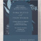 Our Winter Azure wedding invitation surrounds your wedding day details with an arch of vibrant watercolor foliage. A modern yet organic choice for winter or spring weddings featuring intricately painted botanical elements. Colorway: Winter Azure, a medley of frozen blues on a dark background.