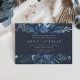 Our Winter Azure wedding invitation in a landscape format frames your wedding details with a top and bottom border of watercolor foliage in icy shades of navy and sky blue. A modern yet organic choice for winter weddings featuring intricately painted watercolor botanicals.