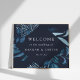 Welcome guests to your wedding with our Winter Azure poster, featuring a geometric border of icy blue watercolor greenery, foliage and botanical leaves, with "welcome to our wedding," your names, and wedding date in a chic mix of modern serif and italic typefaces.