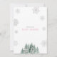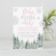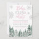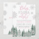 The invitation features snowflakes and evergreen pine trees with pink Christmas lights. This design is perfect for a winter baby shower for a girl.