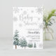 Winter baby shower invitation with silver glitter effect, and watercolor pine trees.