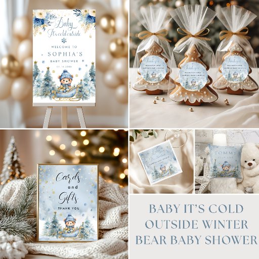 Baby It's Cold Outside, Winter Bear Baby Shower Poster | Cards and Gifts Sign (Blue & Gold)