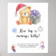 "There's a Beary Sweet baby on the way". Celebrate with this teddy bear themed baby shower party! Watercolor cute teddy bear with christmas gift, in santa hat. On the reverse side of the card are holiday christmas pattern (candy cane, christmas tree ball toy, christmas socks). Matching items available.