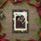 Introducing our enchanting foil Christmas card, where timeless elegance meets the beauty of the season. The rich charcoal black background, artfully distressed with soft white accents, sets a captivating tone. Your favourite photo will shine, surrounded by a double foil and cream frame that adds a touch of refinement. Embrace the spirit of winter with a breathtaking frame of lush greenery, featuring holly adorned with rich red berries, mistletoe with its delicate white berries, and the timeless allure of green pine. This winter wonderland-inspired design captures the essence of the season and exudes natural grace and festive charm. Created by Simply Farmhouse Press.