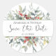 This design features an illustration of greenery foliage and red berries in watercolor style. Personalise with your names and wedding date. Text "Save the date" is written in a Script font.