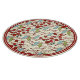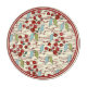 This charcuterie board features a lovely original design of a flock of robin's egg blue & avocado green birds sitting together in cosy pairs on wiry thin branches covered w/ sprigs of juicy cranberry red berries on a cream coloured field, bordered in dark red and cream.