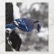 Beautiful song bird photo taken in Ringtown Pennsylvania, North America. The feathers are blue and black on this curious bird. A winter snow storm has left the trees laden with the white fluff where the blue jay is just hanging out.