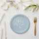 Personalised Christmas paper plates feature white handwritten calligraphy "merry Christmas" script and tree on winter blue textured background, simple, modern and elegant.