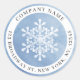 Personalised round Christmas company return address labels feature decorative white snowflake and border on watercolor light blue background, modern and trendy.