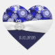Winter Blue & White Snowflake Wedding Envelope Seals - jazz up your wedding invitation envelopes with these heart shaped seals decorated in the matching wedding invitation suite below. Each sticker (seal) features a navy blue, electric blue, white and grey colour scheme print of elegant snowflakes with a printed white ribbon decorated with a round diamond buckle embellishment. Use the personalise feature found to the right of the demo to change the date to you match your special day, you can also click on the orange customise button below the demo to add more text boxes, change the font, colour or style to meet your needs.