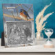 Pretty little bluebird wintering over resting on a branch against a backdrop of snow frame personalised create your own photo easel back tabletop plaque. Nature photography by Susan.