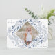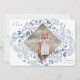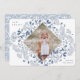 Elegant holiday photo card features a favourite photo surrounded by a geometric border of delicate blue botanical foliage and tiny watercolor flower blossoms on a white background. "Joy and light" appears at the upper left corner, with your family name at the lower right.