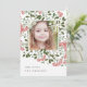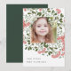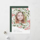 Elegant holiday photo card features a favorite photo surrounded by a geometric border of lush green botanical foliage and tiny red watercolor flower blossoms. Your custom holiday greeting and family name or names appear at the bottom in chic gray lettering. Personalize the back with two additional photos and a personal message against a hunter green background.