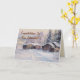 Rustic winter scene features snow covered cabins and ground with rolling hills background.. Text says Congratulations On Your Retirement.