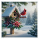Bring the serene beauty of a winter wonderland to your home with this stunning AI-generated image. A vibrant red cardinal, a symbol of hope and joy, perches gracefully on a rustic, snow-covered birdhouse. The birdhouse is beautifully adorned with a festive Christmas wreath featuring bright red poinsettias, berries, and evergreen branches, all dusted with a fresh layer of glistening snow. The background reveals a peaceful, sunlit forest of snow-laden pine trees, creating a tranquil and magical scene.