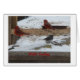 Nature wild bird photography, of two male Northern Cardinals and a Black-eyed Junco feeding on snowy ground, and a winter greeting adorn this card--blank inside for your own personal message.