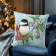 A chickadee perches on a snow-dusted tree branch in this winter illustration. Christmas holly and the little bird is surrounded by two holiday ornaments—one round and one teardrop-shaped—both adorned with festive patterns and rich seasonal colours. Snowflakes and snow falling all around in a backdrop of light blue.