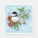 A chickadee perches on a snow-dusted tree branch in this winter illustration. Christmas holly and the little bird is surrounded by two holiday ornaments—one round and one teardrop-shaped—both adorned with festive patterns and rich seasonal colours. Snowflakes and snow falling all around in a backdrop of light blue.