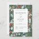 This design features pine, eucalyptus, red and blue berries, and other green foliage, surrounding a thin faux gold frame and white text box. It's part of the Winter Christmas Greenery Wedding Suite of cards created by Simply Farmhouse Press.