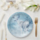 Paper plates with an image of a majestic deer in wintertime. An icy blue filtered background gives this photo a cold winter look with a magical feel. This proud, noble animal stands on a hill with wintery pine trees off in the distance.