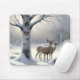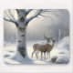A peaceful winter scene showcases two deer standing close together in a snow-covered forest by a birch tree with a heart-shaped carving.