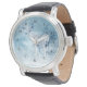 A watch with an image of a majestic deer in wintertime. An icy blue filtered background gives this photo a cold winter look with a magical feel. A noble deer stands on a hill with wintery pine trees in the background
