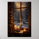 The "Winter Evening with a Warm Candlelit Window Poster" transports viewers to a serene scene where the quiet beauty of a snowy evening is illuminated by the gentle glow of candlelight. This captivating artwork captures the essence of cosiness and tranquillity, inviting viewers to embrace the warmth and comfort of a winter's night.