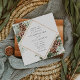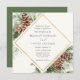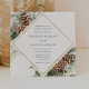 Elegant Winter-themed wedding invitation features a gold frame surrounded by watercolor evergreen, pines and winter florals. Personalise with your information or click "Click to customise further" to edit font styles, size and colours.