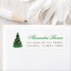 In the left there is a watercolor painted pine tree with snow. On the right, the name is written in an elegant green calligraphic script, the address in small caps.