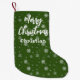 Modern christmas stocking features a design with white snowflake pattern and personalised script family member name text in white.