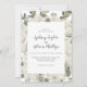 This winter floral casual wedding invitation is perfect for an elegant wedding. The simple design features white flowers with winter greenery and eucalyptus leaves, with a modern country feel.