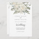 This winter floral front and back wedding invitation is perfect for an elegant wedding. The modern design features white flowers with winter greenery and eucalyptus leaves, with a simple country feel.