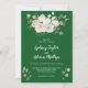 This winter floral on emerald green casual wedding invitation is perfect for an elegant Christmas wedding. The simple design features white flowers with winter greenery and eucalyptus leaves, with a modern country feel.